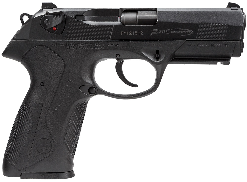 Beretta's Px4 Storm features an exclusive Beretta-designed locked breech with a rotating barrel system which reduces felt recoil and muzzle rise. The chrome-lined barrel provides extreme corrosion resistance and also features a deeply-recessed combat muzzle crown to protect the rifling. The light yet durable frame employs modern thermoplastic technology through the use of technopolymer-reinforced fiberglass and features an integral Picatinny MIL-STD rail. The Px4 Storm has an ambidextrous safety/decocking lever and a reversible magazine release and it may be configured with a small medium or large backstrap for individual fit (3 backstraps included). The modular structure ergonomics and interchangeability of parts make the Px4 Storm the ideal firearm for law enforcement use and personal defense.This 40 S&W model comes with a 14-round magazine.