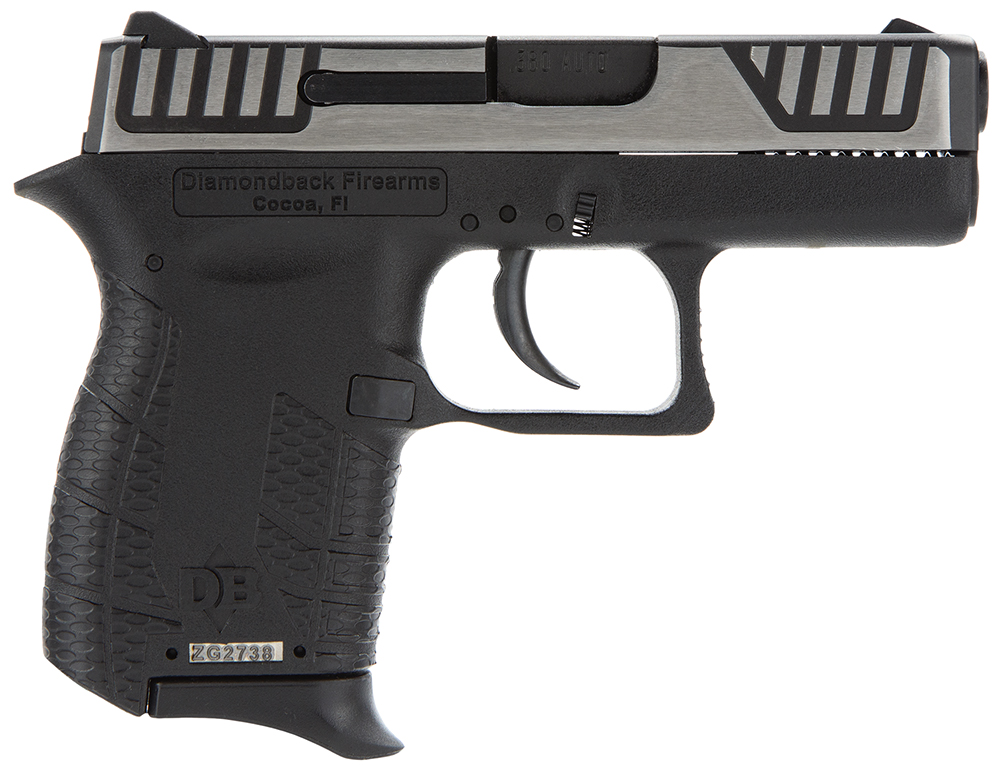 Diamondback's DB380 lightweight micro-compact pistol made entirely in the USA. Designed with safety in mind the DB380 features a ZERO-Energy striker firing system with a mechanical firing pin block. It also has a steel magazine catch and real windage-adjustable sights. The steel trigger with dual connecting bars allows for a crisp smooth trigger pull while the FEA (Finite Element Analysis) designed slide and barrel is stronger than any comparable firearm. The slide barrel and internal parts features a corrosion resistant coating making this pistol a lifetime investment.This model has a 2.8 barrel and a black frame with silver slide.