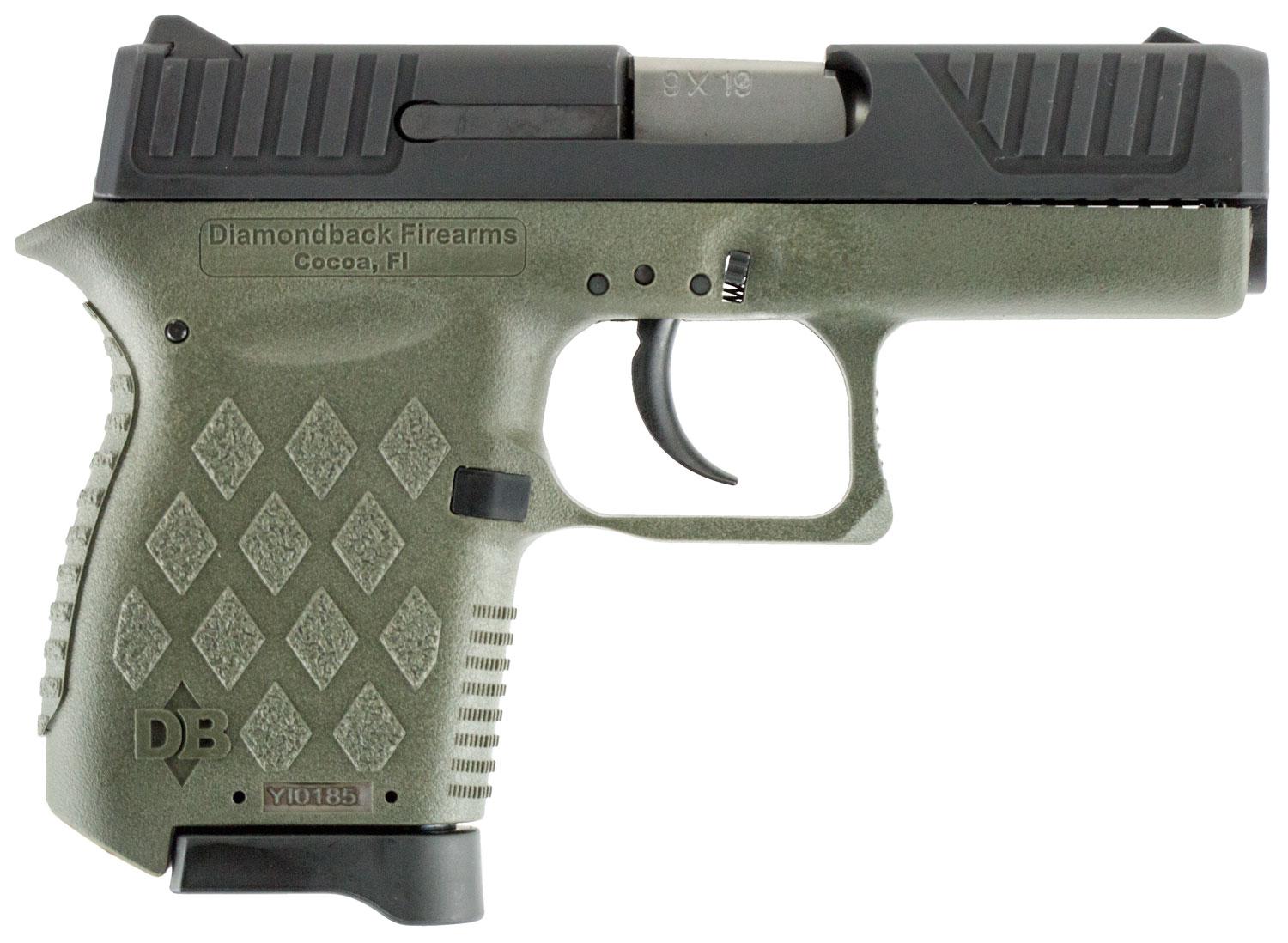 Diamondback's DB9 lightweight micro-compact pistol made entirely in the USA. Designed with safety in mind the DB380 features a ZERO-Energy striker firing system with a mechanical firing pin block. It also has a steel magazine catch and real windage-adjustable sights. The steel trigger with dual connecting bars allows for a crisp smooth trigger pull while the FEA (Finite Element Analysis) designed slide and barrel is stronger than any comparable firearm. The slide barrel and internal parts features a corrosion resistant coating making this pistol a lifetime investment.This model has a 3 barrel and an OD green frame with black slide.