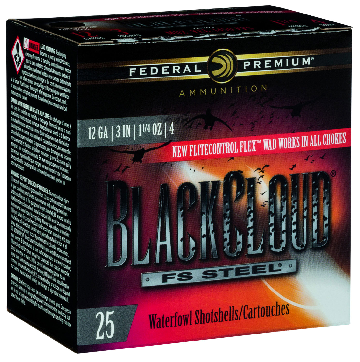 Product Description FED PWBX1424 BLKCLD 12 3IN 11/4 25/10 Mfg Item Num: PWBX1424 Model Number: Black Cloud Purpose: Waterfowl Series: Waterfowl Unit of measure: BX Gauge: 12 GaugeType: SteelLength: 3Ounces: 1-1/4 ozShot Size: 4Muzzle Velocity: 1450 fpsRounds Per Box: 25