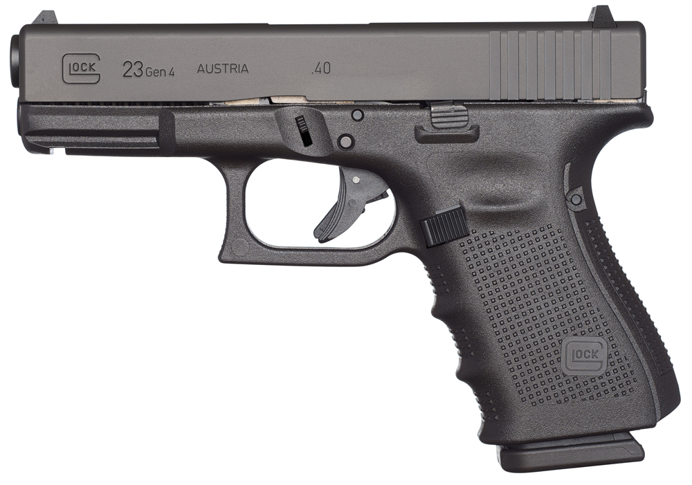 This Glock 23 Gen 4 in 40SW introduces revolutionary design changes to the pistol that combines compact dimensions for both open and concealed carry with minimum weight-despite its large magazine capacity. The modular back strap design lets you instantly customize the grip to adapt to an individual shooter's hand size. The frame employs the scientifically designed real-world-tested Gen 4 rough textured technology. Internally the dual recoil spring assembly substantially increases the life of the system. A reversible magazine catch changeable in seconds accommodates left or right-handed operators. The G23 Gen 4 in .40 caliber retains the Glock accessory rail for your attachments.This G23 Gen4 Compact model has a black frame with black slide fixed sights and a 13-round capacity.