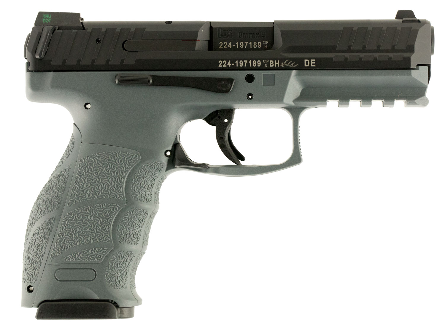 The VP Series is Heckler & Koch's first striker-fired HK since the P7 series pistols introduced in the 1980s. It is well-suited for civilian sport shooting security military and law enforcement use. The VP Series integrates a striker firing system with an enhanced HK light pull trigger. HK's cold hammer-forged barrel made from cannon grade steel ensures long service life as does the polygonal bore profile which also provides a slight increase in muzzle velocity. The VP uses HK's ergonomic handgun grip design that includes three changeable backstraps and six side panels accommodating all hand sizes. Molded finger grooves in the pistol's grip position an operator's hand for optimal shooting. An extended Picatinny MIL-STD-1913 rail molded into its polymer frame for mounting lights and accessories. All controls are completely ambidextrous. Slide releases are present on both sides of the frame and the paddle-style magazine release can be easily activated by left- or right-handed shooters. A unique VP feature is HK's patented rear-mounted charging supports on each side of the slide provide better gripping leverage for racking the slide rearward. The machined steel slide is protected from corrosion and wear by HK's hostile environment finish and all metal components including springs and pins have superior metallurgy. VP pistols use proven HK P30 steel magazines.This model has a Gray frame black slide with night sights and includes three (3) 10-round magazines.