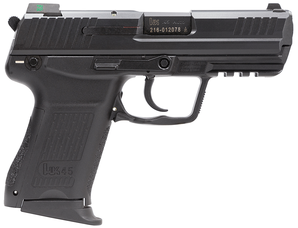The HK45 Compact is well-suited for personal defense use featuring a DA/SA trigger system with a safety/decocking lever on the left side. The HK45C features a slim-line grip shorter barrel and slide than the standard HK45 but it is otherwise functionally identical to the standard HK45. The HK45C can be fitted with a threaded barrel for use with a muzzle-mounted sound suppressor. The internal mechanical recoil reduction system reduces the recoil forces imparted to the weapon and shooter by as much as 30% improving shooter control during rapid firing and increasing component service life. This pistol features a MIL-STD 1913 Picatinny rail ambidextrous controls with dual slide releases enlarged magazine release night sights polygonal rifling for longer barrel life and increased accuracy. This model ships with 3 magazines and an additional backstrap.