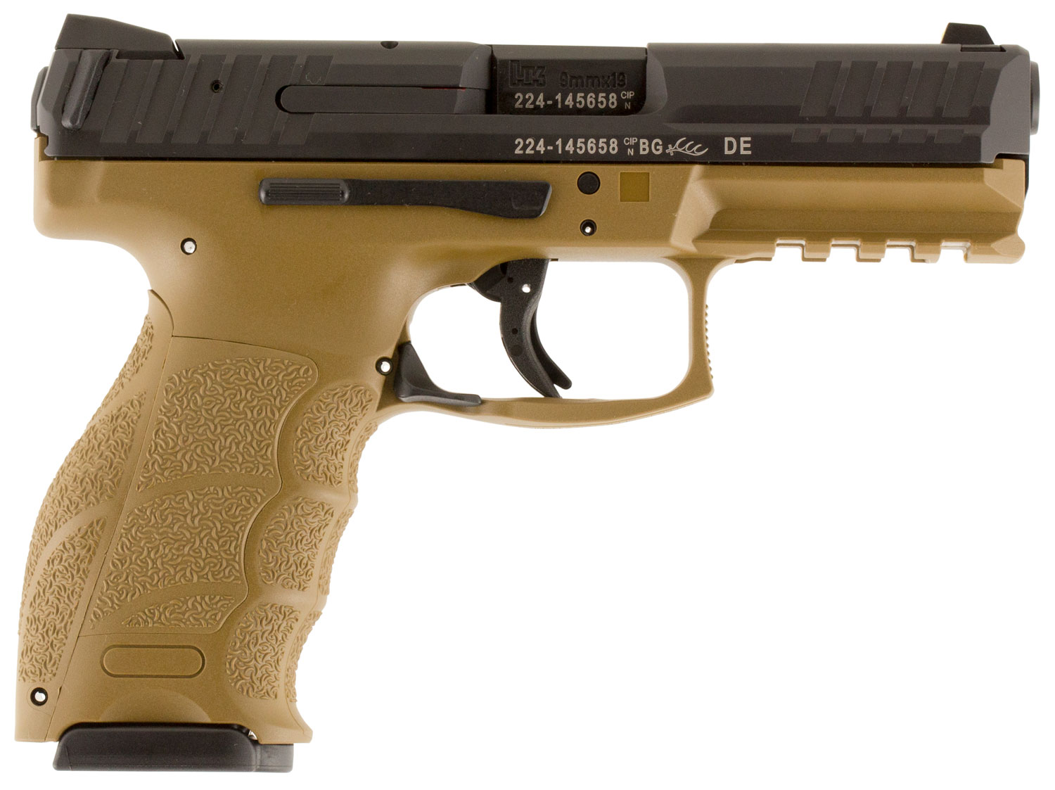The VP Series is Heckler & Koch's first striker-fired HK since the P7 series pistols. It is well-suited for civilian sport shooting security military and law enforcement use. The VP Series integrates a striker firing system with an enhanced HK light pull trigger. The cold hammer-forged barrel made from cannon grade steel ensures long service life as does the polygonal bore profile which also provides a slight increase in muzzle velocity. It uses an ergonomic handgun grip design that includes three changeable backstraps and six side panels accommodating all hand sizes. Molded finger grooves in the pistol's grip is ideal for an operator's hand for optimal shooting. A unique VP feature is HK's patented rear-mounted charging supports on each side of the slide provide better gripping leverage for racking the slide rearward. The machined steel slide is protected from corrosion and wear by HK's hostile environment finish and all metal components including springs and pins have superior metallurgy. The VP9 also has an extended Picatinny MIL-STD-1913 rail molded into its polymer frame ambidextrous controls a slide release on both sides of the frame and the paddle-style magazine release. This model comes with 3-dot sights and includes two (2) 15-round magazines.This model has a Flat Dark Earth frame black slide with 3-dot sights and includes two (2) 15-round magazines.