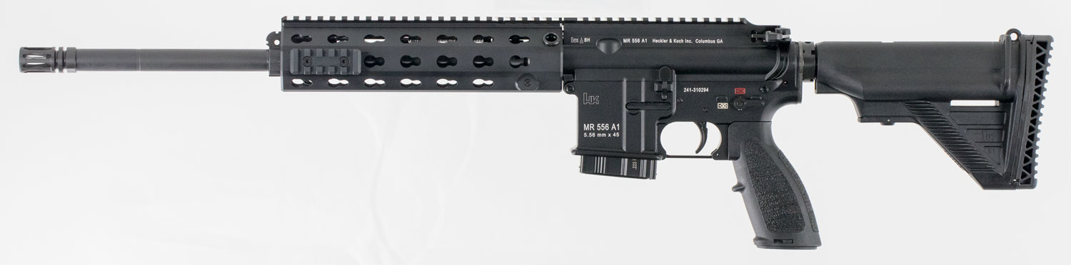 A direct descendant of the HK416 the MR556A1 is a semi-automatic rifle configuration with match rifle capability developed for civilian users. he MR556A1 uses the HK proprietary gas piston operating system employing a piston and a solid operating pusher rod which virtually eliminates malfunctions common to direct impingement gas systems since hot carbon fouling and waste gases do not enter the receiver area. The HK Modular Rail System (MRS) is truly free-floating for maximum accuracy. The MRS handguard has a more ergonomic design yet retains many features from the previous FFRS. It uses an HK proprietary keyhole design to allow the attachment of Picatinny rail segments to the handguard. The MR556A1 also has a Picatinny rail machined into the top of its upper receiver for mounting optics and mechanical sights. Major subassemblies including the upper receiver/barrel assembly are fully interchangeable with other high quality AR-style firearms. The MR566A1 is produced in the USA from both American and German-made components. The German-made unchromed barrel is produced by HK's famous cold hammer forging process with the highest quality steel for a barrel that provides superior accuracy and long service life.This model is CA-compliant. It is supplied with a 9 MRS handguard Troy Microsights and one 10-round magazine with HK's Raddlock configuration.