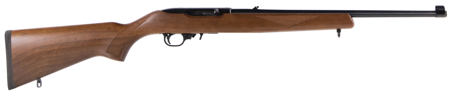 The Ruger 10/22 rifle is America's favorite 22 LR rifle and it's ideally suited for informal target shooting plinking small game hunting and action-shooting events. This model features a hammer-forged barrel locked into the receiver by a unique two-screw V-block system a precision-machined A380 aluminum alloy receiver and a patented detachable rotary magazine with a unique rotor to separate cartridges and provide reliable feeding. This rifle comes with a combination scope base adapter for both Weaver-style and 22 tip-off scope mounts and the 10/22 Sporter features a flatt buttplate with a rubber buttpad and sling swivels.