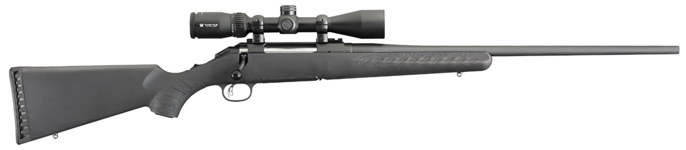 Ruger's American Rifle offers minute-of-angle accuracy that can make every hunt a success. The one-piece three-lug bolt with 70 degree throw provides ample scope clearance and utilizes a full diameter bolt body and dual cocking cams for smooth easy cycling. Its patent-pending Power Bedding integral bedding block system positively locates the receiver and free-floats the barrel for outstanding accuracy. The ergonomic lightweight synthetic stock with soft rubber buttpad is designed for quick easy handling and blends a classic look with modern forend contouring and grip serrations. The American Rifle also has a Ruger Marksman adjustable trigger cold hammer-forged barrel and a tang safety.This 243 Winchester model has a 22 matte black barrel black synthetic stock rotary magazine and sling swivel studs. It includes a factory-installed Vortex Crossfire II 3-9x40 riflescope with the Dead-Hold BDC reticle.