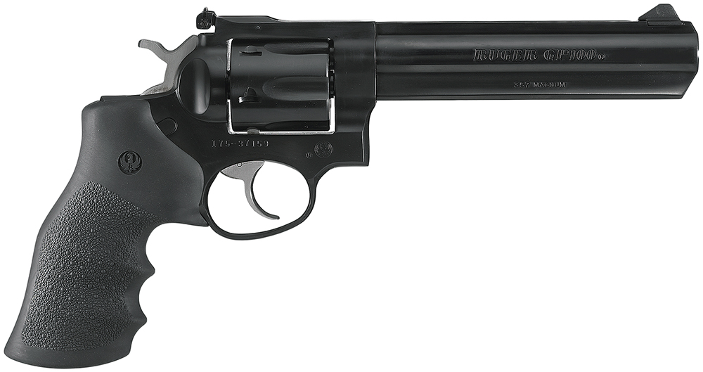 Ruger's GP100 revolver features a triple-locking cylinder that is locked into the frame at the front rear and bottom for more positive alignment and dependable operation. Its patented transfer bar mechanism provides an unparalleled measure of security while the integrated sub-assemblies allows for easy maintenance and assembly. The grip frame design easily accommodates a wide variety of custom grips.This Standard model has a blued 6 barrel frame and cylinder. It also has a black Hogue Monogrip and a red ramp front sight with an adjustable rear.