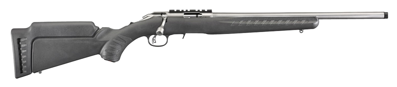Ruger's American Rimfire rifle features a patent-pending Power Bedding integral bedding block system which positively locates the receiver and free-floats the barrel for outstanding accuracy. The cold hammer-forged barrel results in ultra-precise rifling which provides exceptional accuracy longevity and easy cleaning. The American Rimfire rifle also has a Ruger Marksman Adjustable trigger tang safety easy-to-use 10/22-style extended magazine release and a 3/8 rimfire scope base that is machined into the receiver which is also drilled and tapped. Included is Williams' fiber optic front sight and adjustable V slot folding-leaf rear and sling swivel studs.This Standard model has an 18 stainless steel barrel black synthetic stock with two long length of pull modules and a detachable flush-mounted 10/22 BX-1 10-round rotary magazine.