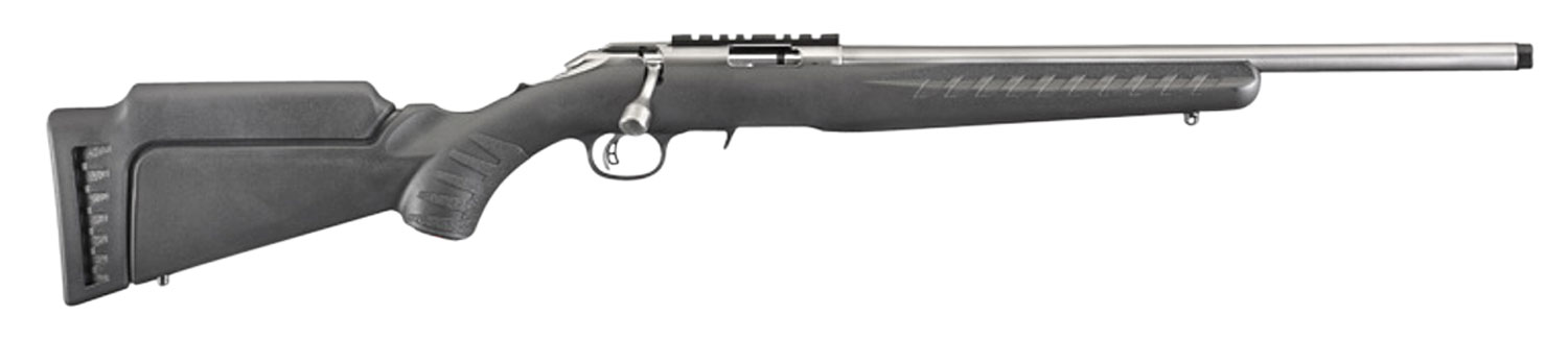 Ruger's American Rimfire rifle features a patent-pending Power Bedding integral bedding block system which positively locates the receiver and free-floats the barrel for outstanding accuracy. The cold hammer-forged barrel results in ultra-precise rifling which provides exceptional accuracy longevity and easy cleaning. The American Rimfire rifle also has a Ruger Marksman Adjustable trigger tang safety easy-to-use 10/22-style extended magazine release and a 3/8 rimfire scope base that is machined into the receiver which is also drilled and tapped. Included is Williams' fiber optic front sight and adjustable V slot folding-leaf rear and sling swivel studs.This Standard model has an 18 stainless steel barrel black synthetic stock with two long length of pull modules and a detachable flush-mounted JMX-1 9-round rotary magazine.