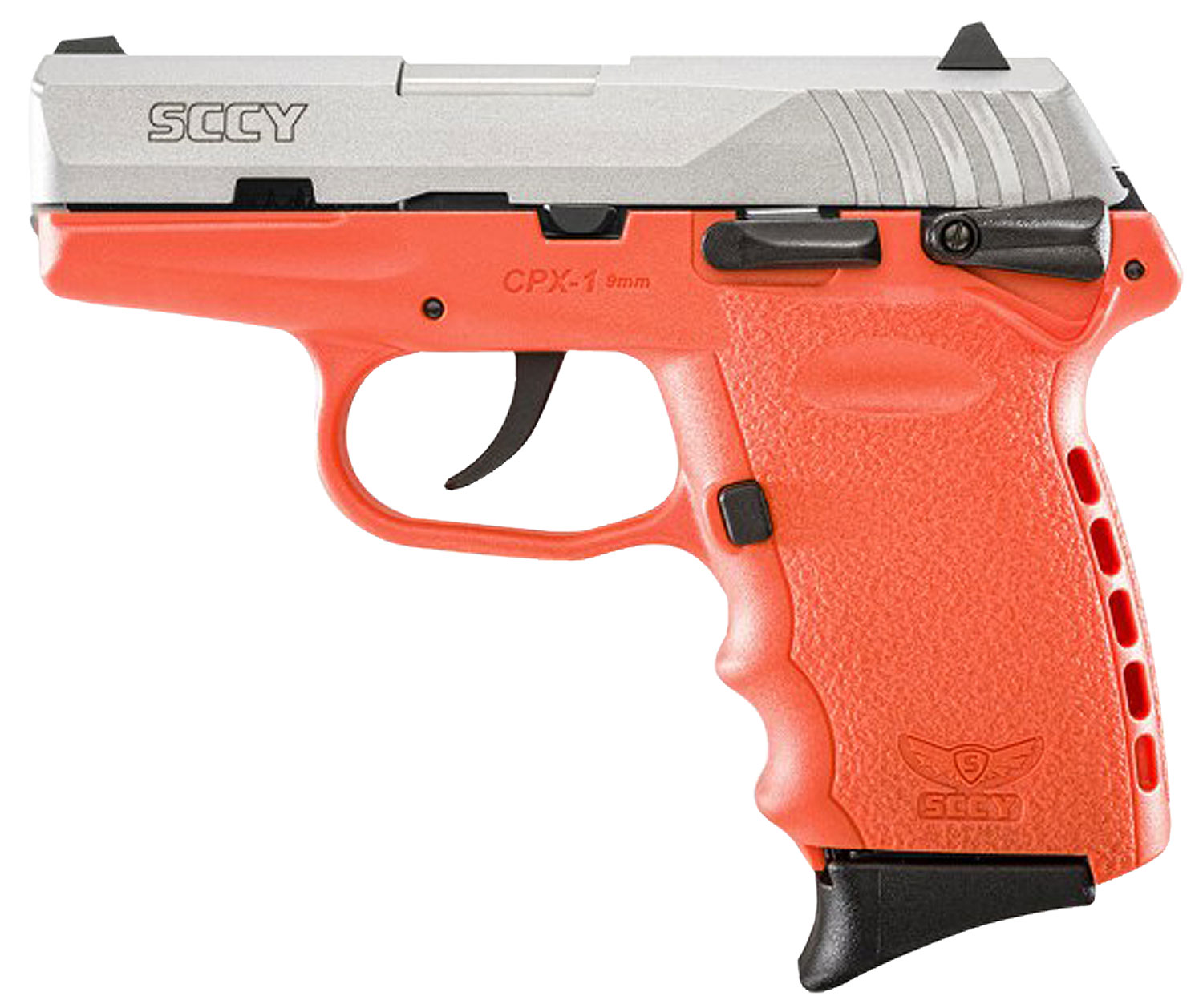 SCCY's CPX-1 is designed for concealed carry but large enough to get a good firm grip. It is considered to be one of the best priced precision made Pocket Pistols on the market. Chambered for 9mm it has a 3.1 barrel with a 16:1 right hand twist. The receiver is made from 7075 T6 aircraft grade heat treated aluminum alloy. The Zytel polymer frame features ergonomic finger grooves and an integral recoil cushion on the backstrap. The slide is machined from stainless steel with a Zytel overmolded polymer extension for ease of operation. It has 3-dot sights with a windage-adjustable rear. This DAO has an internal hammer with inertial firing pin to prevent accidental discharge and an external thumb safety with a guard molded into the frame. It has a smooth consistent 9-pound trigger pull. It comes with two 10-round magazines with finger extensions bases installed and two flat magazine bases. This CPX-1 has a satin slide with an orange frame.