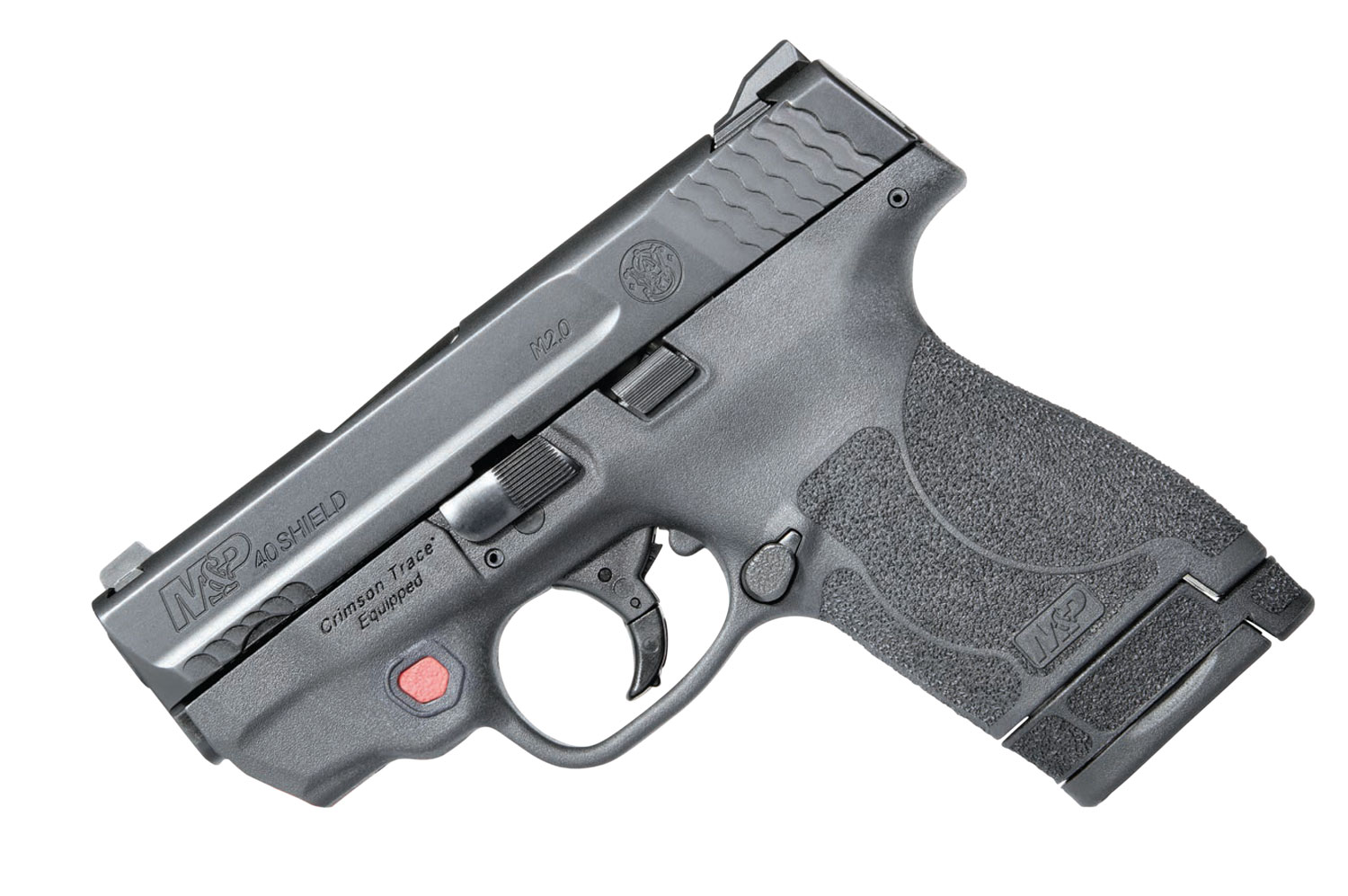 Smith & Wesson M&P pistols have a reinforced polymer chassis superior ergonomics and proven safety features. In designing the M&P S&W considered the needs of military and law enforcement from every conceivable angle so the M&P is the standard in reliability. M&P's patented take-down lever and sear deactivation systems allow for disassembly without pulling the trigger.The M&P Shield is easy to conceal offering professional grade features with simple operation and reliable performance day or night. It puts the power and features of full sized M&P pistols into a slim lightweight pistol the size of your hand.M&P M2.0 models feature aggressive grip texture for enhanced control M&P M2.0 crisp trigger with lighter trigger pull and a tactile and audible trigger reset. The stainless steel barrel and slide have an Armornite corrosion-resistant finish.This model has a black frame and slide finish no manual safety 3-dot sights and an integrated red Crimson Trace laser. It includes one 6-round magazine and one 7-round extended grip magazine.