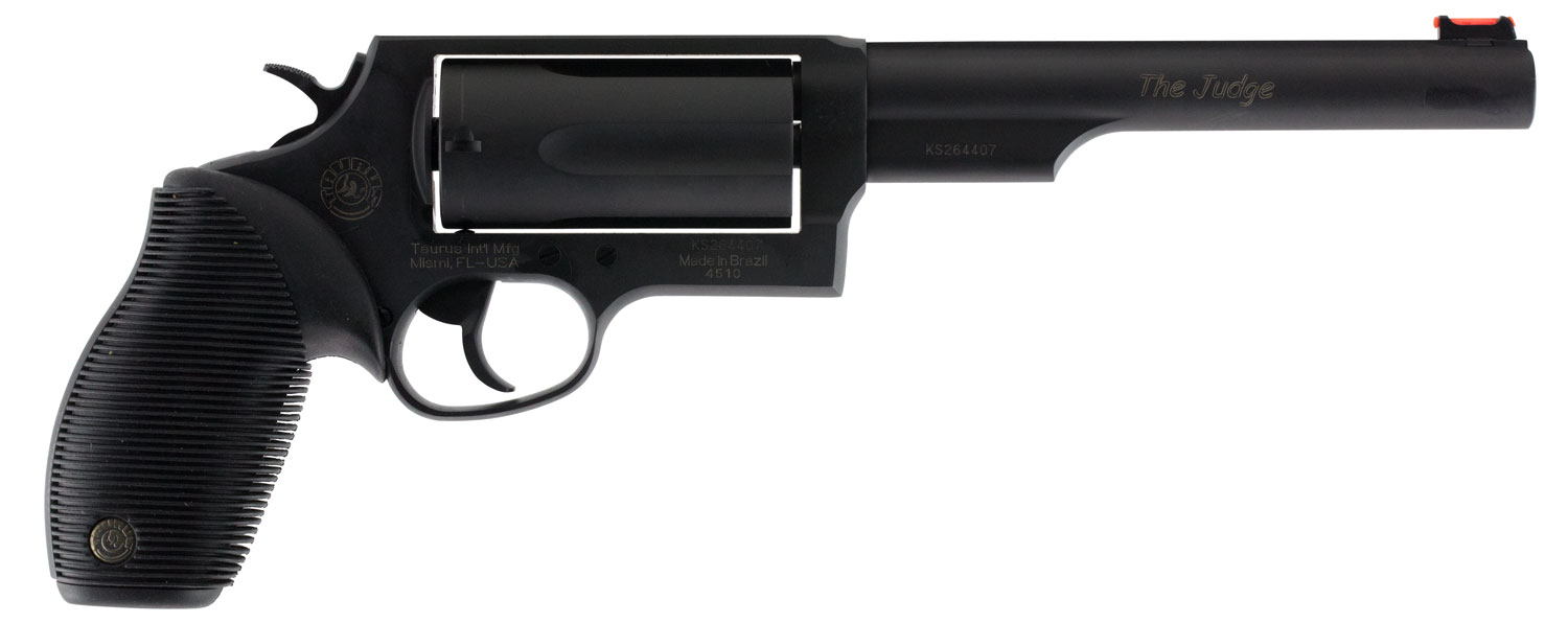 The Taurus Judge Magnum is capable of chambering both .410 gauge 2.5 or 3 shotshells and 45 Colt ammunition. This amazing combo is ideal for short distances where most altercations occur or longer distances with the 45 Colt ammo. Taurus has finely tuned the rifling to spread the shot pattern at close quarters or to guide the .45 caliber bullet to the target. This model has a 6.5 barrel with a fiber optic front sight and fixed rear. It has a matte black metal finish and a black Ribber grip.