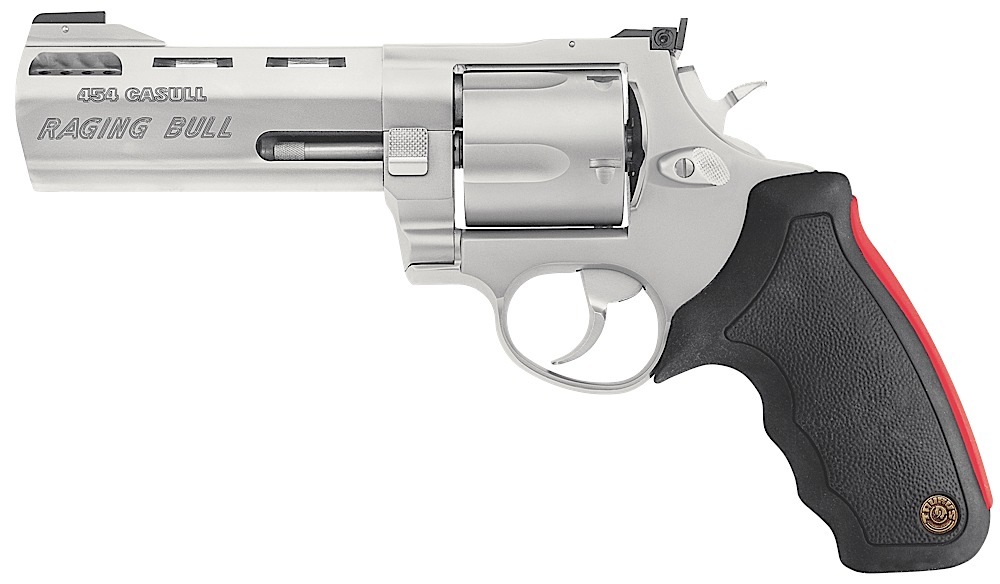 The Original Raging Bulls are still among America's favorite hunting handguns. Chambering the popular and powerful 454 Casull rounds the mighty 454 revolvers are built for a lifetime of tough use. Offering award-winning designs in four distinct barrel lengths these monsters feature a crisp trigger break and smooth pull for accuracy cushioned grips and factory porting to reduce felt recoil. Dual lockup cylinder provides stability under extreme chamber pressures. Cushioned insert grip. Exclusive on the Raging Series large frame revolvers cushioned insert grip pillows recoil and makes shooting comfort a reality. Porting referred to as factory tuned porting and gas expansion chamber for recoil and makes shooting comfort a reality.