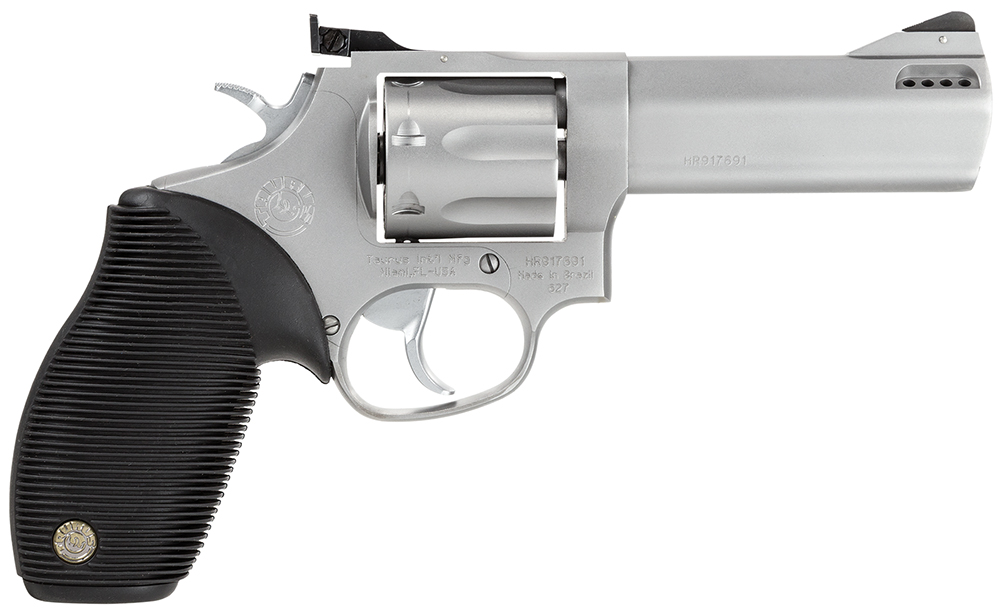Extremely comfortable to fire and easy to control the Tracker Series maintains a high level of accuracy rock-solid performance and near-indestructible construction. The Model 627 revolver 357 Magnum has a 7-round cylinder and makes a practical choice for backpacks and tackle boxes especially where there are bears and other predators around. It has a transfer bar safety as well as the Taurus Security System. The 627 Tracker features factory-tuned barrel porting and a gas expansion chamber for recoil as well as the ergonomic shock-absorbing Ribber grip. It has a matte stainless steel metal finish with a fixed front sight and adjustable rear sight.This model has a 4 barrel.