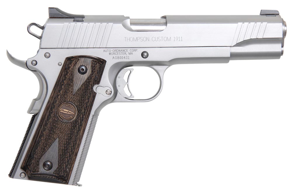 The Thompson Custom 1911 frames are machined on high precision computerized machinery from a 420 stainless steel casting. The slide is machined from a solid stainless steel billet utilizing specialized tooling to reduce set-up and refixturing. The combination of high precision equipment and fewer set-ups result in a higher quality and more consistent final product at a lower price. The slide and frame are finished in an attractive matte finish markings are laser-engraved including the distinctive Thompson bullet logo on the slide. Front and rear sights are black with serrations and are dovetailed into the slide. The ejection port is flared and the slide has front and rear serrations machined at a slight angle. The mainspring housing is checkered and the frontstrap is machine checkered at 20 lines per inch. Additional features include an adjustable trigger combat hammer stainless steel full-length recoil guide rod extended beavertail grip safety; extended magazine release; checkered laminate grips with a Thompson bullet logo inlay and a checkered slide stop lever.