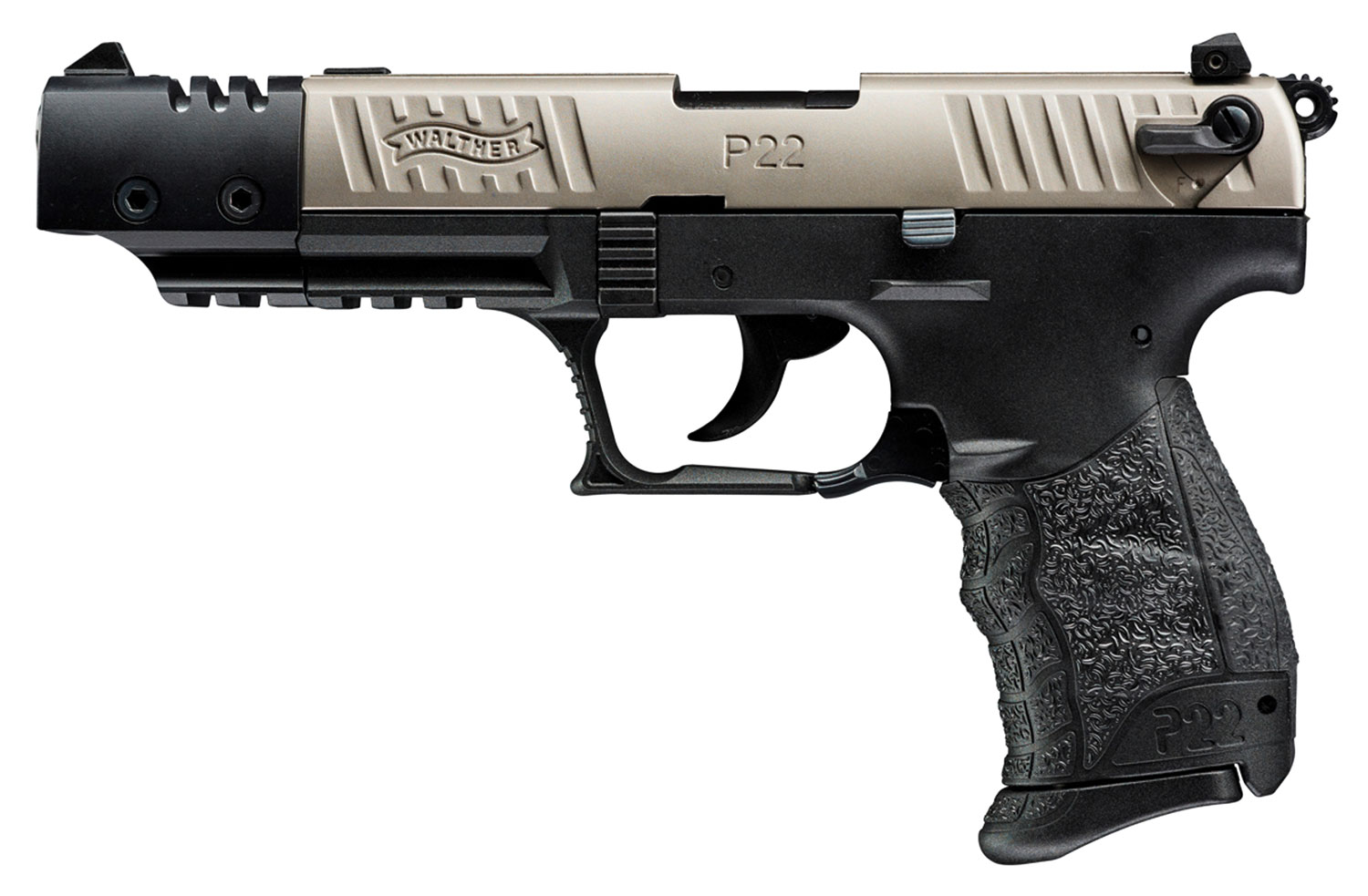 Walther adapted the tactical styling and performance design concepts from their centerfire handguns and applied them to the P22 rimfire pistol. The Picatinny rail makes it a snap to mount a light or laser. Low profile three-dot polymer combat sights won't snag clothing and are rear adjustable for windage. The slide has front and rear slide serrations for a non-slip surface with distinctive Walther styling. It has a loaded chamber indicator for quick status inspection an external slide stop locks back on empty and three safeties - manual external magazine disconnect automatic firing pin block safety.This Target model had a 5 barrel zinc die cast slide with a nickel/black finish and a 10-round magazine. This model is California compliant.