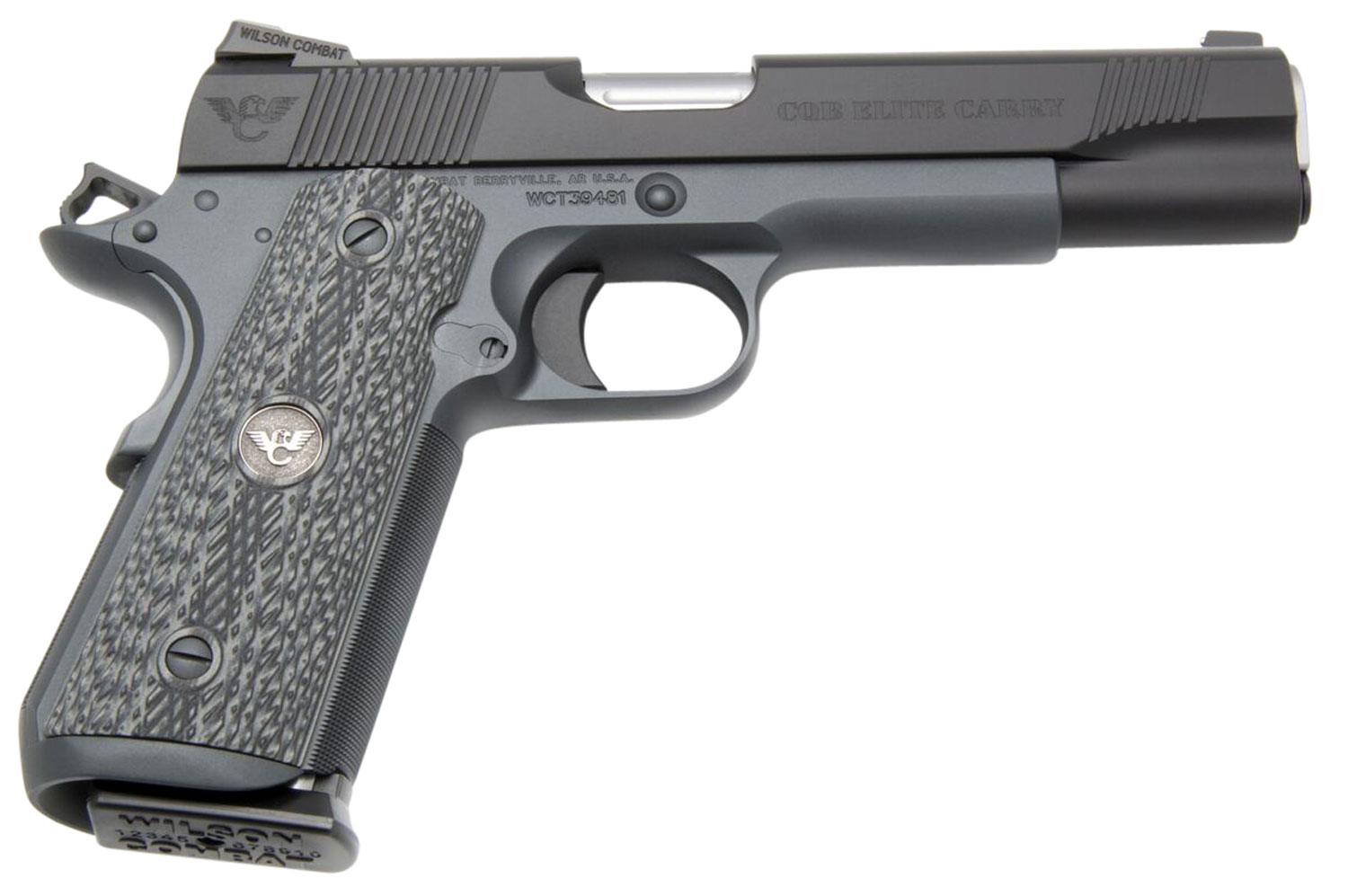 Wilson Combat Custom Pistols are hand built by master pistolsmiths with the finest modern materials and parts machined from forgings and billet steel. Wilson's CQB Elite is a soft shooting shooting range or tactical pistol suited for the shooter looking for a hybrid range/carry gun with specially selected upgrades to enhance downrange performance and comfort when carried concealed. The CQB Elite Carry has an Armor-Tuff gray frame with a black slide. It has a concealment beavertail and hammer medium length trigger gold bead front sight round butt flush cut/reverse crown barrel countersunk slide stop barrel chamber fluting and WC slant grips in gray/black.